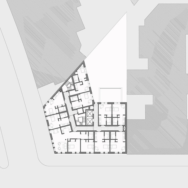 This 8-story corner building is configured on a chamfered triangular site facing the Grand Concourse and Bedford Park Blvd. Entry is made into an expansive lobby containing a series of lounges and including a double height community room facing the rear garden. The unit configuration on the upper floors takes advantage of southern and western exposures with end units taking up the site irregularities.