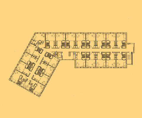 Proposed 80-Unit residence for a mix of low income and clients living with a mental illness. The building is sited on a large irregularly shaped lot across from Brookdale Hospital in the East New York neighborhood in Brooklyn. The 80 studio units are organized in a bent five storey bar along the avenue edge of the site. This massing serves to define two outdoor public areas: the south-facing forecourt together with the adjacent multi-purpose room is to be used by the neighborhood for community gatherings, while the generous residents' garden is sheltered from the dominant presense of the hospital. This garden, which is contained by a masonry wall with a secondary entrance, borders the smaller-scaled residential neighborhood to the north and east. The congregate program spaces are located on the ground floor with direct access to the garden and are complimented by a lounge and exercise room on the upper floors. These appear as smaller-scaled subtractions in the large surface of the avenue facade.