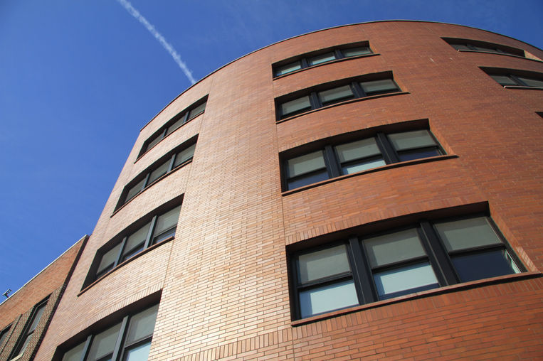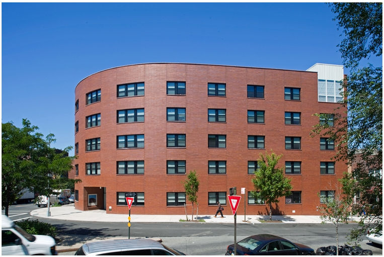 The volume of this new 43-unit residence follows the curve of the irregular corner site which faces onto Claremont Park. Public rooms are located at the ground floor, with a community room set at the top floor facing the park. The balance of the street-wall building is filled out by studio units organized along a naturally lit corridor using Kalwall translucent panels. The raised congregate terrace leading from the lobby is defined along its southern and western edges by continuous planters.